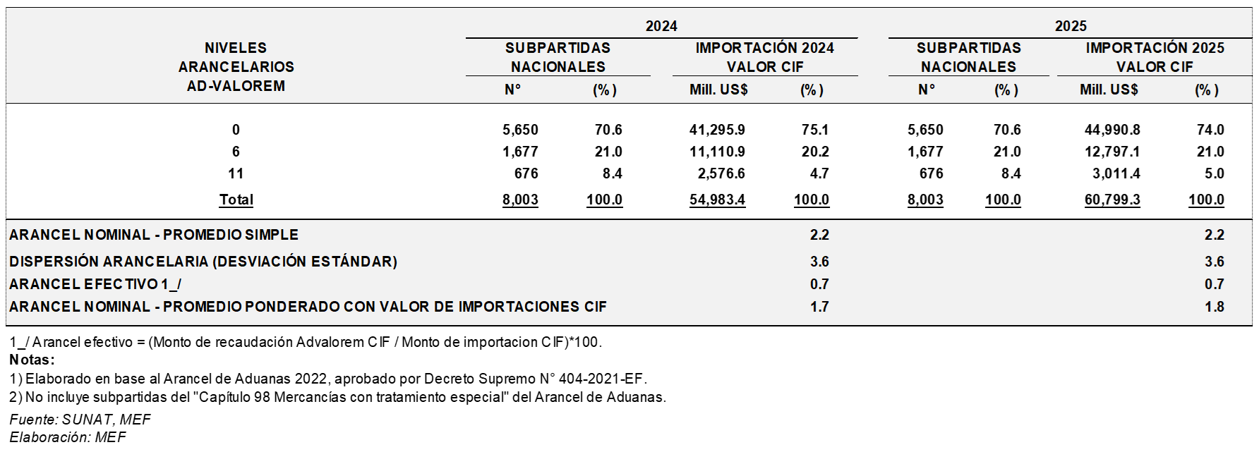 El arancel promedio nominal se mantiene en 2,2 por ciento desde el año 2024 al 2025 (el promedio ponderado es 1,7 y 1,8 por ciento, respectivamente, para los años 2024 y 2025) y la dispersión arancelaria es de 3,6 puntos porcentuales desde el 2024. En virtud de la vigencia de los acuerdos comerciales con los principales socios comerciales del Perú, los cuales han eliminado aranceles para el comercio bilateral o han ido reduciendo el arancel NMF según calendarios de desgravación, el arancel efectivo (recaudación arancelaria efectiva como proporción del total del valor CIF de importaciones) se mantiene en 0,7% en los años 2024 y 2025.