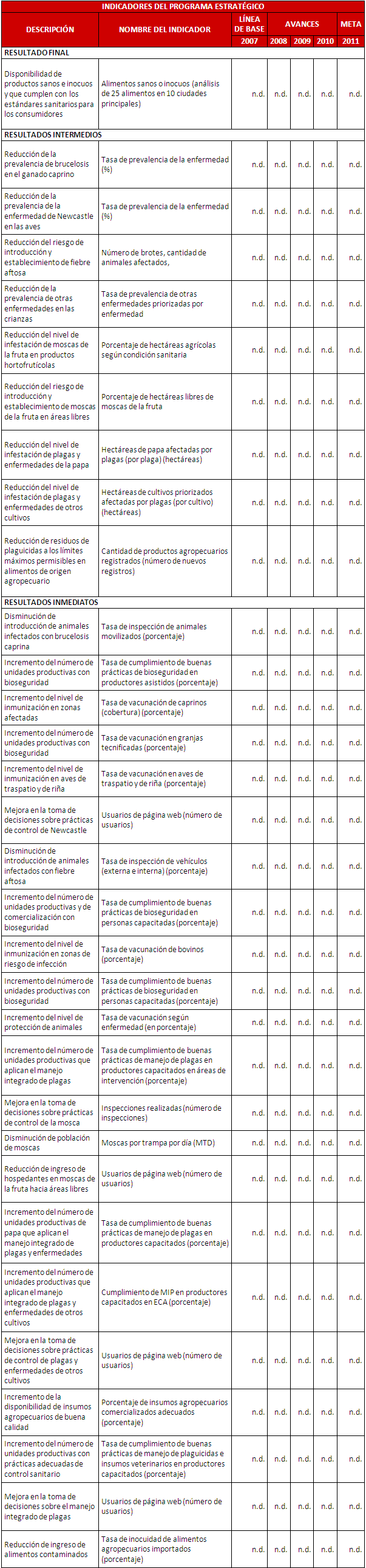 Cantidad de insumos agrarios registrados (número de registros) Porcentaje de insumos agropecuarios comercializados verificados (porcentaje de insumos que cumplen con características de calidad) Tasa de cumplimiento de buenas prácticas de manejo de plaguicidas e insumos veterinarios en productores capacitados (porcentaje) Tasa de cumplimiento de buenas prácticas de manejo de plaguicidas e insumos veterinarios (porcentaje) % de productores de alimentos y piensos informados, por producto Tasa de inocuidad de alimentos agropecuarios importados, en base a 25 alimentos priorizados (porcentaje)