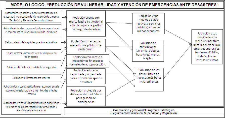 Orientado a conseguir resultados vinculados a la reducción de la vulnerabilidad de la población y sus medios de vida ante la ocurrencia de amenazas naturales tales como: El Fenómeno El Niño, lluvias intensas, heladas y sismos. Comprende un conjunto de intervenciones articuladas entre el Ministerio de Agricultura, Ministerio de Vivienda, Construcción y Saneamiento, Ministerio de Transporte, Ministerio de Salud, Ministerio de Educación, INDECI, los Gobiernos Regionales y los Gobiernos Locales.