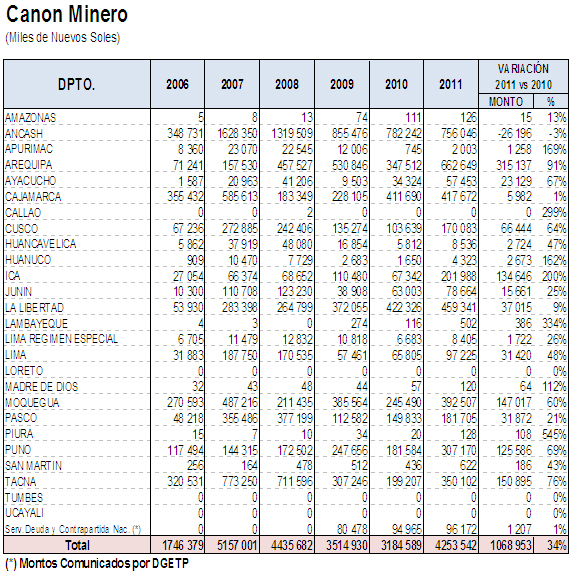 Índices de Distribución del canon minero que se harán efectivas en el 2011,