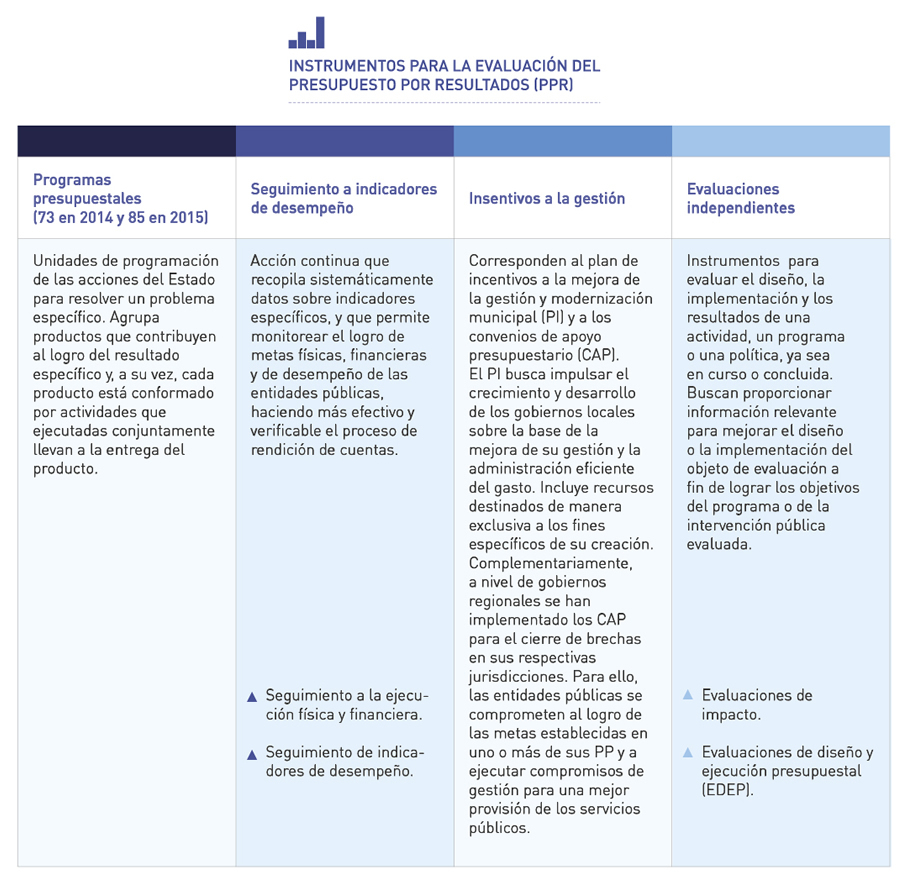 1 Los instrumentos del PpR que permiten la triangulación y la complementariedad de información en aras de una mejor toma de decisiones en materia presupuestaria son: 1) los programas presupuestales; 2) las acciones de seguimiento a los indicadores de desempeño; 3) los incentivos de gestión; y 4) las evaluaciones independientes, dentro de las cuales se encuentran las EDEP y las evaluaciones de impacto.