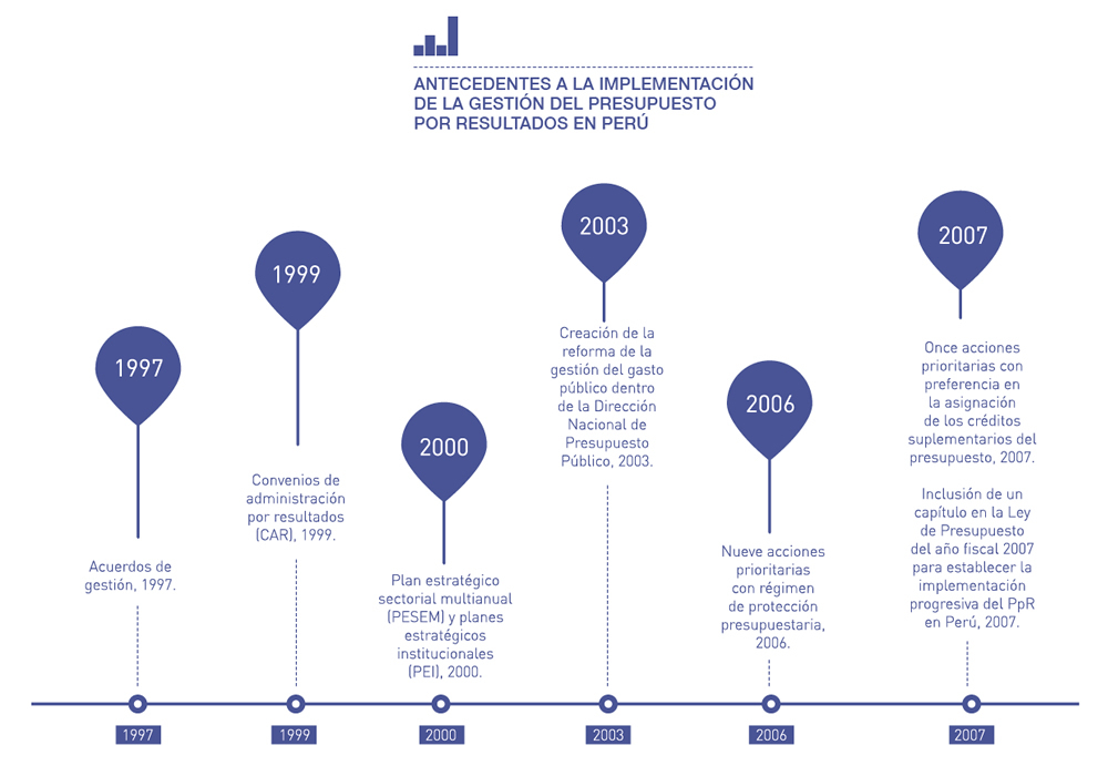 La gestión del presupuesto con enfoque a resultados se ha implementado de manera progresiva y ha transformado integralmente el ciclo presupuestal. Además de implicar la aplicación conceptual de su metodología al diseño de los PP, dicha aplicación debe reflejarse en la ejecución del gasto, la cual está sujeta al seguimiento de los indicadores de desempeño y producción en el Estado, así como a evaluaciones. Dicho proceso de implementación cuenta con un conjunto de antecedentes que vale la pena resaltar a continuación: Antecedentes a la implementación de la gestión del presupuesto por resultados en Perú (ver imagen)
