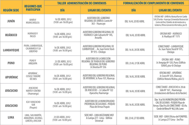 Chunka soqtayoq p’unchay hinaspa iskay chunka qanchisniyoq p’unchaykunan, kay kikin llaqtakunapi, “DGPI” nisqa aswan llank’ay yanapaykunata warayoq wasikunapaq ruwanqaku– aswan sasa cheqaq mana allin ruwayninkutan rikuchinqaku– chayman hina aswan allinta takyaspa chay “e convenios Foniprel” nisqapi suti qelqanta churanankupaq. Khayna “asistencia técnica” nisqataqmi haywakunqa llapan warayoq wasikuna a”taller” nisqa aswan llank’ayninku yachaypi kanapaq yachaqman haykuqkunallapunitaqmi.