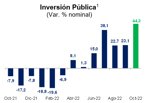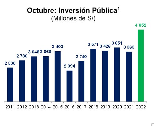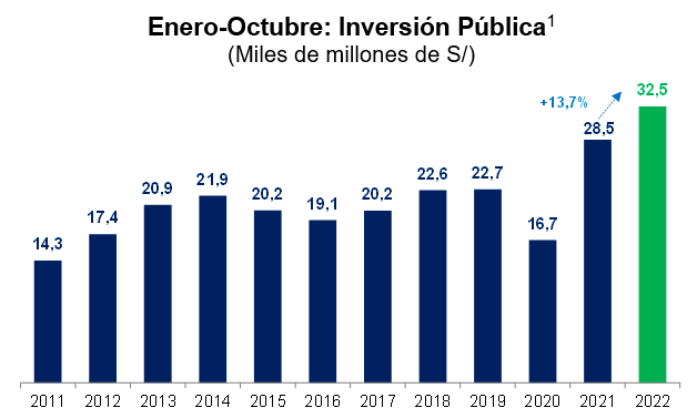 En el acumulado entre enero y octubre de 2022, el monto de inversión pública llegó a los S/32 463 millones, lo que representa máximos históricos y es 13,7% más que el mismo periodo reportado en el 2021. Así, la inversión pública viene desempeñando un rol clave para promover el dinamismo de la actividad económica, crear puestos de trabajo formales, y cerrar brechas de infraestructura.