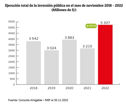 En noviembre la ejecución de la inversión pública alcanzó al mayor nivel de ejecución de todos los años, acelerando la tendencia positiva de los 8 meses consecutivos del presente año y logrando ejecutar S/ 5 307 millones, lo que representa un crecimiento de 65,1% respecto al mismo mes del año pasado.