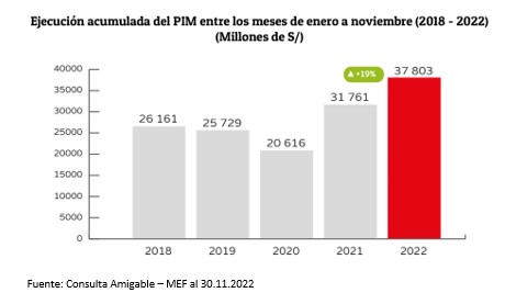 Con respecto a la ejecución acumulada del Presupuesto Institucional Modificado (PIM), entre enero y noviembre de 2022, el monto devengado por los tres niveles de gobierno alcanzó S/ 37 803 millones, logrando un récord histórico que representa un 19% más que el mismo periodo del 2021. Este avance significa un aporte excepcional al impulso de la economía del país, así como un gran beneficio para la población contribuyendo a brindar más servicios e infraestructura de calidad.