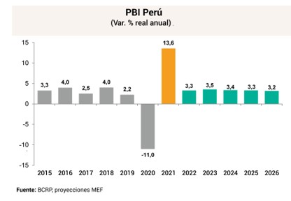 Entre 2022 y 2026, la economía alcanzaría una tasa de crecimiento promedio de 3,3% producto de i) la implementación de un conjunto de medidas que contribuirán a impulsar el gasto privado y público y brindar un entorno de mayor confianza a los agentes económicos; ii) recuperación y resiliencia de la demanda interna en un escenario de vacunación masiva, control de la pandemia, reactivación del turismo e impulso del gasto privado; iii) mayor producción cuprífera que impulsará el volumen de las exportaciones; iv) impulso a la competitividad y productividad, apuntalados por el Plan Nacional de Competitividad e Infraestructura y respuestas de acciones de política provenientes del trabajo en las mesas ejecutivas existentes o por crear; v) en la medida que se observe un incremento en la velocidad del crecimiento interno, con lo previsto en el MMM y el plan de reactivación, todo ello será funcional al logro de una mayor confianza de los consumidores y empresarios.
