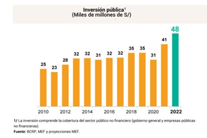 En tal sentido, la inversión pública se afianzará como la principal herramienta para avanzar en el cierre de brechas y fomentar la creación de empleo, generando mayor bienestar en la población, resultado también de su funcionalidad con la inversión privada. En 2022, la inversión del sector público no financiero alcanzará la suma histórica de S/ 48,2 mil millones (8,5% real).