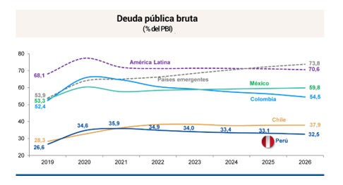 Con ello, la deuda pública continuaría con una tendencia decreciente (34,0% del PBI en 2023, 32,5% del PBI en 2026, 30,6% del PBI en 2030, 28,4% del PBI en 2035 y 26,6% del PBI en 2040). Dichos niveles de deuda pública son significativamente inferiores a la deuda pública promedio de países emergentes (cerca de 75% del PBI) y de América Latina (cerca de 70% del PBI) para 2026.