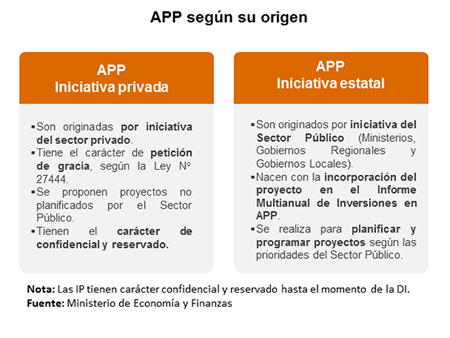 Las APP son originadas por iniciativa de las entidades públicas titulares de proyectos, o por el sector privado mediante la presentación de Iniciativas Privadas (IP).