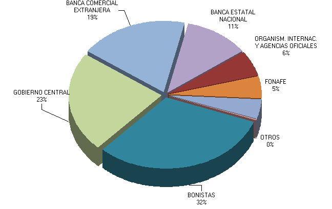 El 31% de la deuda (US$ 572 millones) pertenece a los Bonistas de COFIDE, del cual 22% corresponde a emisiones de bonos realizadas en el exterior y 9% a las realizadas en el mercado local. El 23% (US$ 420 millones) corresponde a financiamientos otorgados por el FONAVI, entidad del Gobierno Central, quien es el principal acreedor de las empresas prestadoras de servicios de saneamiento por los préstamos otorgados para la ejecución de obras públicas en ese sector. El 19% de la deuda (US$ 345 millones) corresponde a la Banca Comercial Extranjera, categoría que tiene como acreedores más importantes al Standard Chartered Bank (10%) y al American Family Life Insurance (6%) por los créditos otorgados a COFIDE. El 11% (US$ 208 millones) corresponde a la Banca Estatal Nacional, en la cual COFIDE es el acreedor de mayor importancia (9%, US$ 168 millones). Otro acreedor que integra este grupo financiero es el Banco de la Nación a quien las entidades adeudan el 2% del saldo. Otros acreedores importantes de las empresas públicas son los Organismos Internacionales como la Corporación Andina de Fomento (2%) y las Agencias Oficiales, como el Instituto de Crédito Oficial de España (3%). La deuda al FONAFE representa el 5% (US$ 94 millones) del saldo y se refiere a los préstamos otorgados a las empresas de este holding. La deuda a la Banca Comercial Nacional representa el 4% (US$ 82 millones), grupo en el cual los acreedores son el BBVA Banco Continental (1%), el Scotiabank del Perú (1%), el Banco Internacional del Perú (1%) y el Banco de Crédito del Perú (1%).