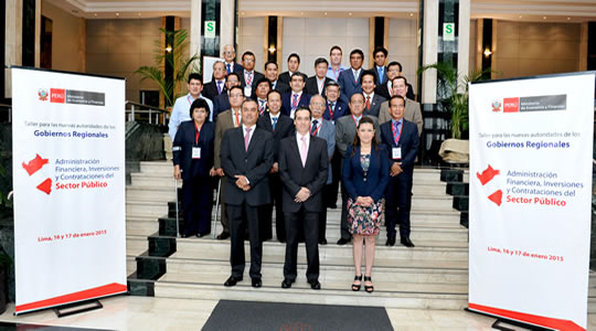 El Taller de Administración Financiera, Inversiones y Contrataciones en el Sector Público, organizado por el sector de Economía y Finanzas, tiene por objetivo brindar capacitación en temas fundamentales de la gestión pública de los gobiernos regionales relacionados con los sistemas administrativos del Estado, particularmente los que maneja el Ministerio de Economía y Finanzas (MEF). Este Taller se realizó los días 16 y 17 de enero, contando con la participación de las direcciones del MEF y la OSCE, quienes expusieron a las autoridades regionales los principales lineamientos en materia de administración, inversiones y contrataciones públicas, para poder efectuar una gestión informada, eficiente y transparente.