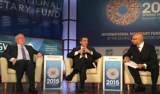 Lima 17 de abril de 2015.- Esta mañana se realizó en la prestigiosa Universidad de Washington el seminario el “Dónde, Cómo y Por qué de la inversión en infraestructura”. El Ministro de Economía y Finanzas, Alonso Segura fue uno de los cinco expositores junto a Mitsuhiro Furusawa, Vice Director General del FMI, Joaquim Levy, Ministro de Finanzas de Brasil, Dr Rajiv Lall, Vice Chairman de la Industria de Infraestructura y Desarollo de la India y Geoffrey Spence, CEO de Infrastructure UK.