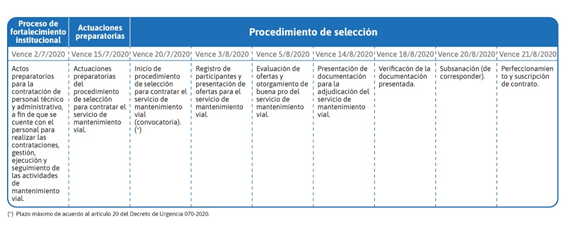 Según el cronograma establecido en el Decreto de Urgencia 070-2020, el 20 de julio es la fecha límite para el inicio de los procedimientos de selección para la contratación del servicio de mantenimiento vial, a través del lanzamiento de convocatorias en el portal institucional del Organismo Supervisor de Contrataciones del Estado.