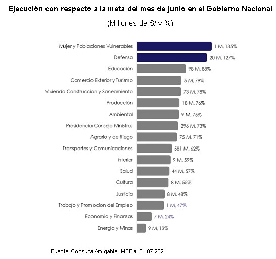 Desagregando el análisis según niveles de gobierno, en junio el Gobierno Nacional ejecutó S/ 1 277 millones respecto a la meta de S/ 1 945 millones, lo que representa un avance de 66%. Este logro se explica por la continuidad en la ejecución de grandes inversiones como la “Creación de los servicios de protección contra inundaciones de las aguas de las avenidas de la cuenca de la quebrada el león en los distritos de la Esperanza y Huanchaco de la provincia de Trujillo - departamento de la Libertad” (S/ 70.9 millones) y la “Creación del servicio de protección en riberas del río Lacramarca vulnerables ante peligros de inundación, en 58 comunidades en los distritos de Macate, Cáceres del Perú y Chimbote de la provincia de Santa - departamento de Ancash” (S/ 56.6 millones), ejecutados por la Autoridad de Reconstrucción con Cambios de la Presidencia del Consejo de Ministros. Asimismo, el sector que tuvo una mayor contribución a la ejecución total del Gobierno Nacional fue Transporte y Comunicaciones con S/ 581 millones (45%), a pesar de haber ejecutado el 62% de su meta. Por otro lado, los sectores que superaron la meta establecida son: Mujer y Poblaciones Vulnerables y Defensa.