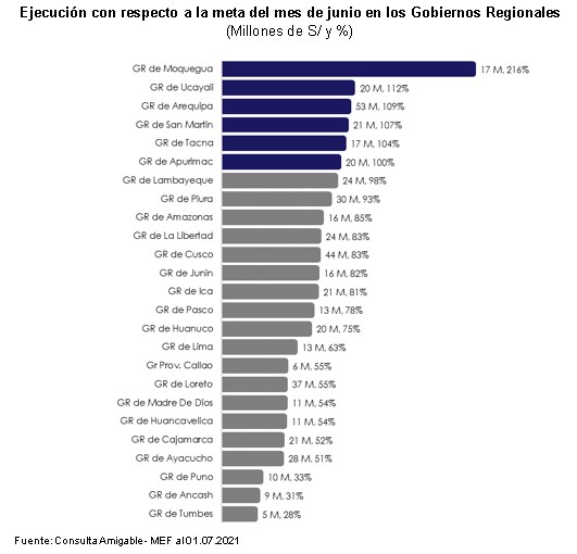 Los Gobiernos Regionales ejecutaron S/ 513 millones respecto a la meta de S/ 696 millones para junio, lo que representa un avance de 74%. Este nivel de ejecución se explica por la ejecución de importantes proyectos de inversión como el proyecto “Ampliación de la frontera agrícola Lomas de Ilo-Moquegua (S/ 2.7 millones) en la región Moquegua, el proyecto “Mejoramiento de los servicios educativos del Instituto de Educación Superior Tecnológico Público Padre Abad” (S/ 4.2 millones) en la región Ucayali. Asimismo, los gobiernos regionales que tuvieron una mayor contribución a la ejecución total del Gobierno Regional (26%) fueron Arequipa con S/ 53 millones, Cusco con S/ 44 millones y Loreto con S/ 37 millones, a pesar de haber ejecutado el 109%, 83% y 55% de su meta, respectivamente. Por otro lado, los gobiernos regionales que superaron la meta establecida son: Moquegua, Ucayali, Arequipa, San Martin, Tacna y Apurímac.