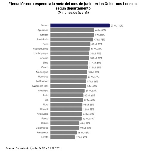 Por su parte, los Gobiernos Locales presentaron una ejecución de S/ 1,193 millones de la meta de S/ 1,833 millones para junio, lo que representa un avance de 65%. Este nivel de ejecución se explica por la ejecución de importantes proyectos como el “Ampliación del tramo norte del Cosac I desde la estación El Naranjal hasta la av. Chimpu Ocllo, distritos de Comas y Carabayllo, provincia de Lima -Lima” (S/ 31.5 millones) ejecutado por la Municipalidad Metropolitana de Lima, el “Mejoramiento y ampliación del sistema de agua potable y alcantarillado con conexiones domiciliarias en la ciudad de Nueva Cajamarca, distrito de Nueva Cajamarca - Rioja - San Martin” (S/ 30.5 millones) de la Municipalidad Distrital de Nueva Cajamarca – San Martín, y la “Rehabilitación del camino vecinal 14.31 km en EMP - LI - 104 - centro poblado Chiquitoy LI EMP LI 104 - El Medano, distrito Santiago de Cao, provincia de Ascope, departamento la Libertad” (S/ 12.1 millones) ejecutado por la Municipalidad Distrital de Santiago de Cao - La Libertad.