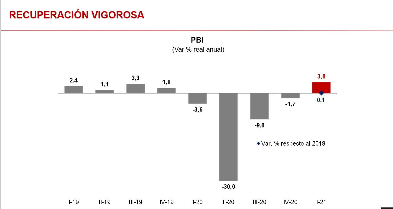 Tras remarcar que el Perú se encuentra en una fase de recuperación vigorosa, con un primer trimestre del 2021 que registró un crecimiento de 3,8% del PBI, sostuvo que hay indicadores económicos alentadores como el crecimiento de las importaciones de bienes de capital, que aumentó en 74,4%, en tanto que la inversión pública se incrementó en 16,4% durante el segundo trimestre versus las tasas de crecimiento del mismo período del 2019, período cuando aún no se ingresaba a la pandemia.