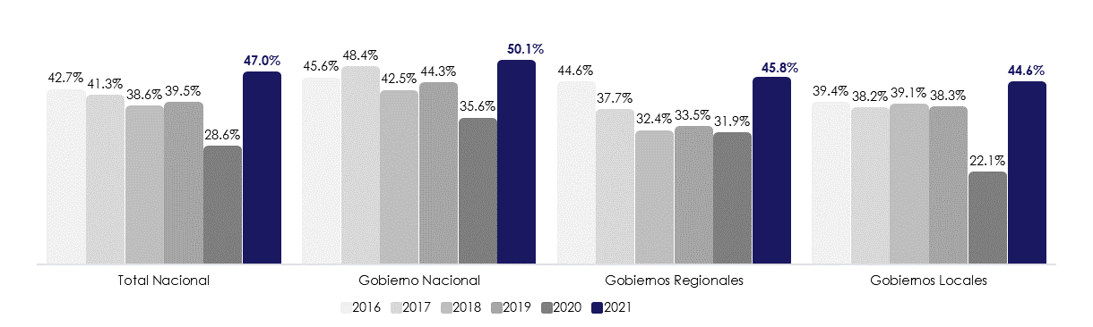 De otro lado, en lo que va del año, la ejecución de los tres niveles de gobierno ha presentado un avance de 50.1% en el Gobierno Nacional (S/ 10 736 millones), 45.8% en el Gobierno Regional (S/ 4 434 millones) y, por último, 44.6% en el Gobierno Local (S/ 9 858 millones).