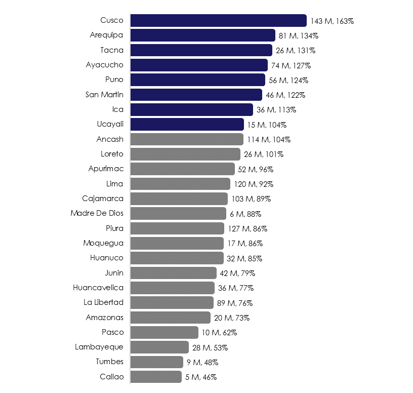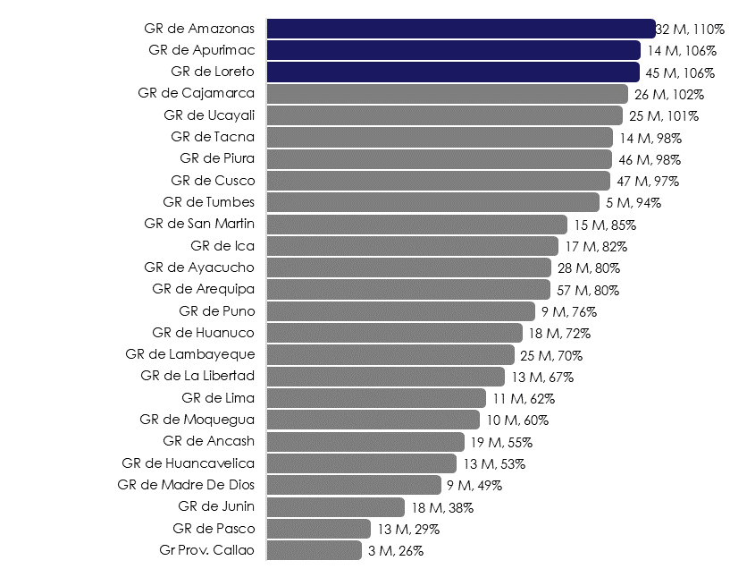 Por su parte, los gobiernos regionales ejecutaron S/ 534 millones respecto a la meta de S/ 716 millones para el mes de setiembre, lo que representa un avance de 75%. Este nivel de ejecución se explica por la ejecución de importantes proyectos de inversión como “Mejoramiento de la carretera Viscachani-Callalli-Sibayo-Caylloma, Provincia Caylloma, Región Arequipa (CUI N° 2194709)” (S/ 20.47 millones ejecutados en el mes de setiembre) a cargo del Gobierno Regional de Arequipa, y el proyecto “Construcción, operación y mantenimiento del túnel trasandino y la primera etapa de la Presa Limón (CUI 2022232)” (S/ 12.9 millones ejecutados en el mes de setiembre) a cargo del Gobierno Regional de Lambayeque.