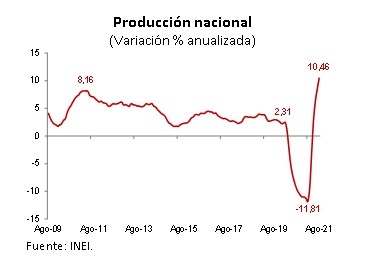 Con las cifras difundidas hoy, en los primeros ocho meses del año, el Producto Bruto Interno (PBI) del país registró un crecimiento de 18,6%, y en los últimos 12 meses el alza llega a 10,5%.