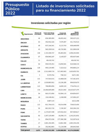 Lima, 19 de noviembre de 2021.- En el marco de la transparencia y debate del Presupuesto Público en el Congreso de la República, el Ministerio de Economía y Finanzas (MEF) publicó la primera lista de las inversiones solicitadas por los parlamentarios para ser incorporadas en el proyecto de Ley de Presupuesto del Sector Público del Año Fiscal 2022.