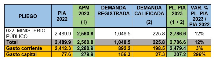 El proyecto de presupuesto asignado al Ministerio Público para el año 2023 asciende a S/ 2,786.6 millones, lo que representa un incremento de 12% respecto al Presupuesto Inicial de Apertura (PIA) del año 2022, que asciende a S/ 2,489.9 millones, de acuerdo con el siguiente detalle: