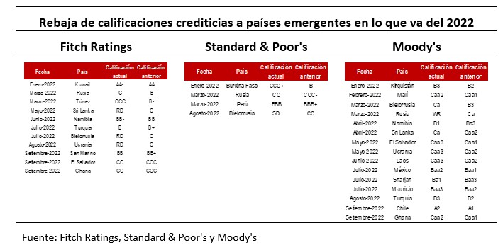Durante el 2022, en un contexto de alta incertidumbre y múltiples riesgos para la economía global, las calificadoras crediticias han realizado diversas rebajas de rating y cambios de perspectiva crediticia a países emergentes. En conjunto; S&P, Fitch y Moody’s; han realizado 30 rebajas de calificación crediticia y 11 cambios de perspectiva crediticia entre enero y setiembre de 2022.