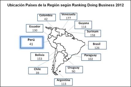 Los resultados del DB 2012 publicado este miércoles 19 de octubre, muestran que el Perú se ubica en el cuarto superior de la tabla, manteniendo su estabilidad económica para hacer negocios y nos posiciona como el segundo país tanto en Sudamérica como en América Latina más atractivo para las inversiones al facilitar la formación y crecimiento de empresas.