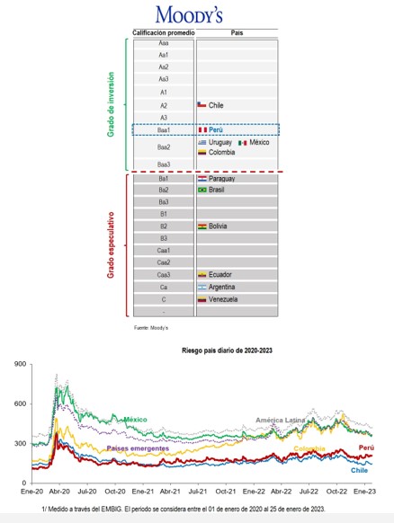 Lima, 31 de enero de 2023.- La agencia internacional Moody’s Investor Services (Moody’s) revisó la perspectiva crediticia de estable a negativa, manteniendo la calificación crediticia del país en “Baa1”, que corresponde a grado de inversión. Con ello, Perú continúa siendo el país con la segunda mejor calificación crediticia de la región, lo que está respaldado por sus bajos niveles de deuda pública y la expectativa de Moody's de que las instituciones y políticas generales del Perú sean efectivas para contener las presiones al gasto fiscal provenientes del entorno sociopolítico.
