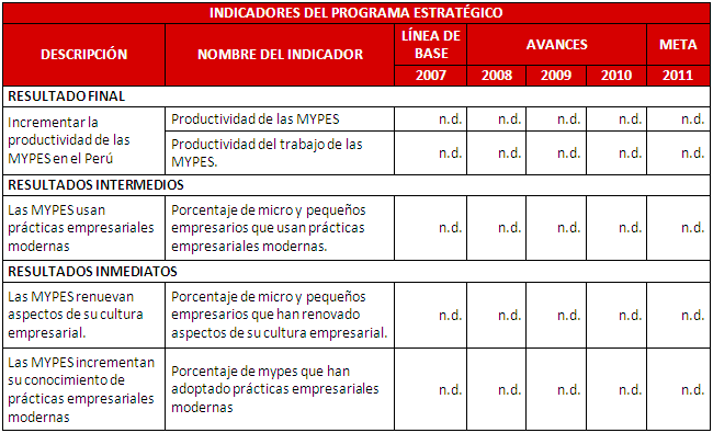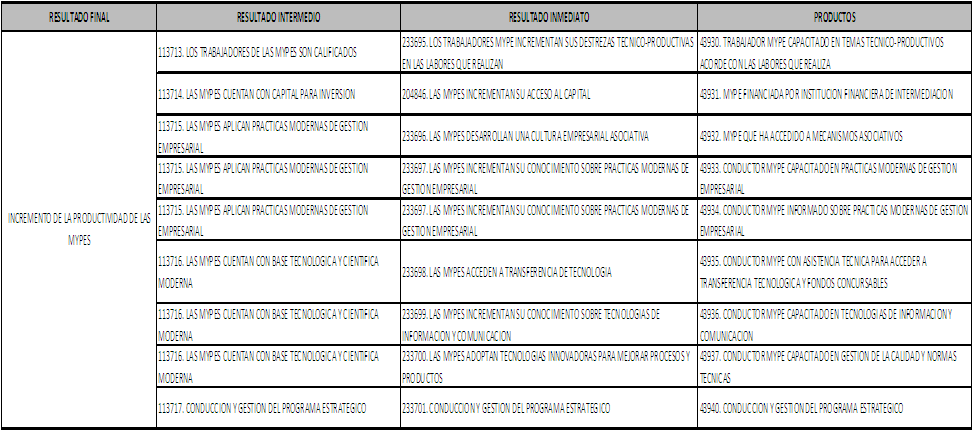 Orientado a conseguir resultados vinculados a incrementar la productividad de la población de micro y pequeñas empresas (MYPES) en el Perú. Comprende un conjunto de intervenciones articuladas entre el Ministerio de la Producción, Gobiernos Regionales y Gobiernos Locales orientadas a mejorar la baja productividad de las MYPES. La rectoría de este programa estratégico esta a cargo del Ministerio de la Producción.