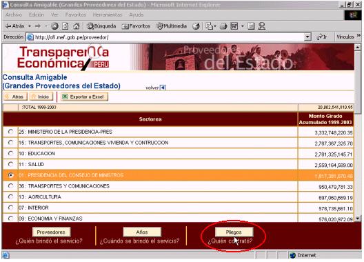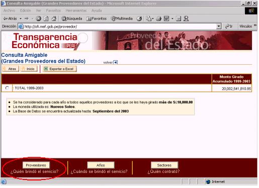 Si queremos conocer cuáles han sido todos los proveedores que han brindado servicios entre 1999 y 2003 damos clic al botón de proveedores (ver círculo rojo al inferior de la Pantalla Nº1) y se obtendrá como resultado la Pantalla Nº2.