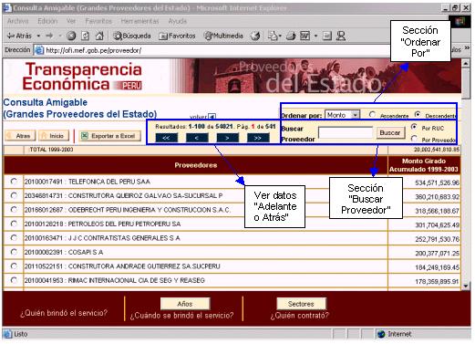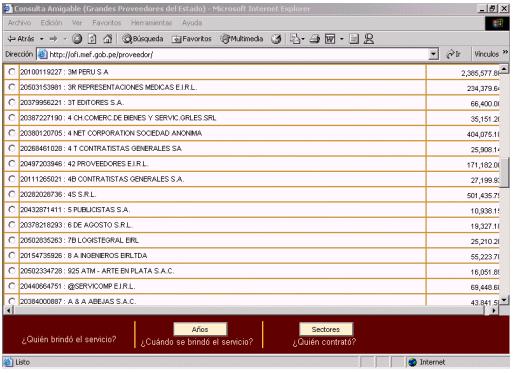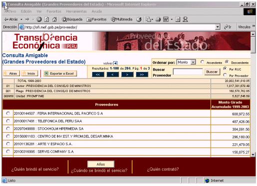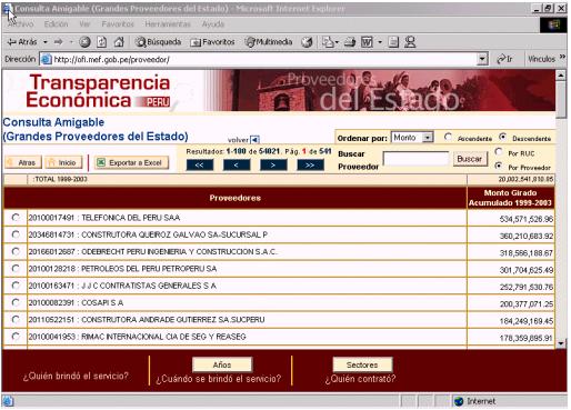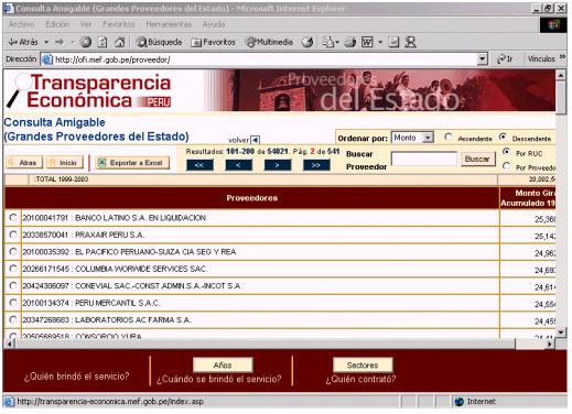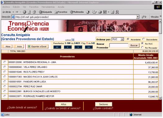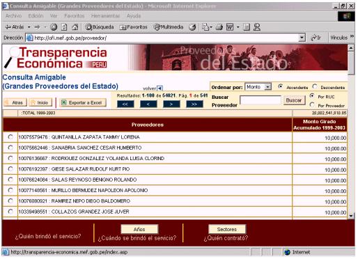 Como se puede observar en la pantalla Nº2, se ve la información de los 100 principales proveedores del Estado, sin embargo, existe un total de 54021proveedores que han percibido más de S/.10,000.00 entre 1999 y septiembre del 2003.