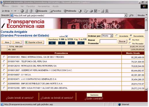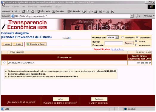 Por ejemplo, en la Pantalla Nº2 vemos que se muestra la relación de proveedores que han brindado servicios entre 1999 y septiembre del 2003 ordenados automáticamente de manera descendente según el monto acumulado que han percibido en dicho período, sin embargo, con el Filtro "ordenar por" tenemos la posibilidad de ordenar la información según otros criterios, como son el número de RUC y el Nombre ó Razón Social del Proveedor.