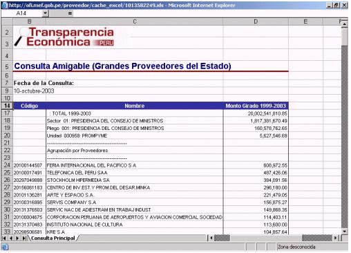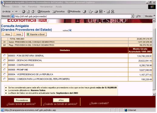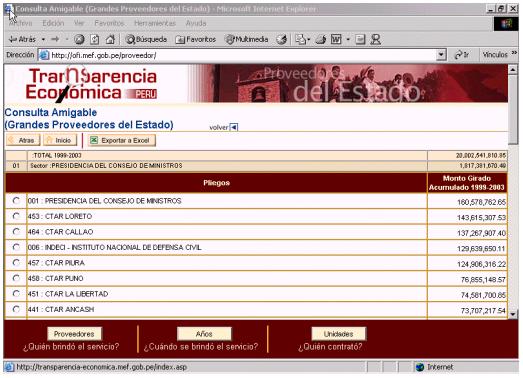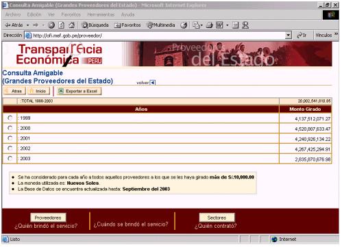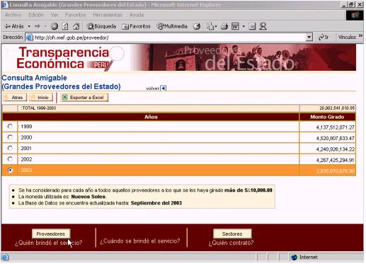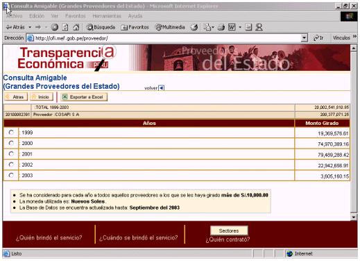 Hasta el momento, hemos visto los montos acumulados en Nuevos Soles para el período 1999-2003. Sin embargo, la consulta permite ver esta información para cada uno de estos años.
