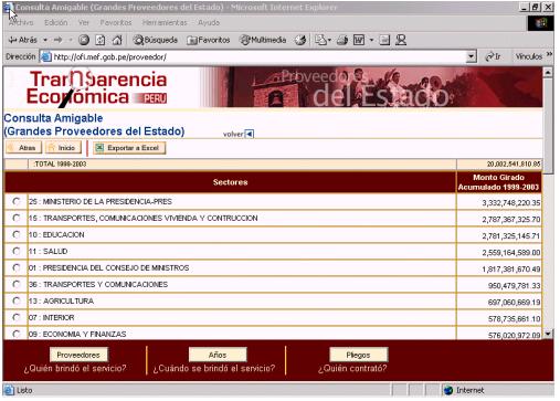 Existe un tercer botón que permitirá conocer qué entidad del Estado requirió de los servicios de los Proveedores. Así si nos ubicamos nuevamente en la pantalla Nº1 haciendo uso del botón "Inicio" y damos clic al Botón "Sectores", se podrá observar (Pantalla Nº14) el monto acumulado en nuevos Soles que destino cada uno de los Sectores del Estado para el período 1999-2003.