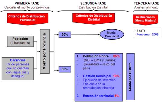| Los montos obtenidos en la segunda fase son ajustados para que a ningún distrito se le transfiera mensualmente menos de 8 Unidades Impositivas Tributarias (UIT) por concepto del FONCOMUN. Asimismo se garantiza no transferir menos de lo transferido por concepto de FONCOMUN en el año 2009. | ||||||||||||