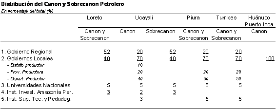La distribución del Canon y Sobrecanon Petrolero es particular para cada departamento involucrado y beneficia a los Gobiernos Regionales, Gobiernos Locales, Universidades Nacionales, Institutos Superiores Tecnológicos y Pedagógicos Estatales e Instituto de Investigación de la Amazonía Peruana.
